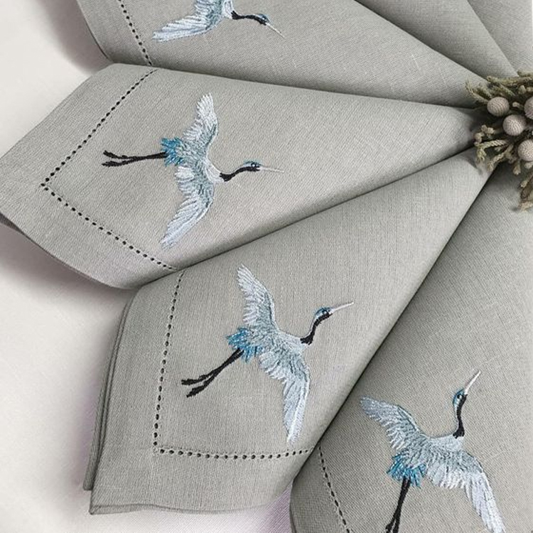 • Wholesale Custom Bird Embroidered Linen Dinner White Logo For Wedding Cloth Dinner 100% Linen Napkins